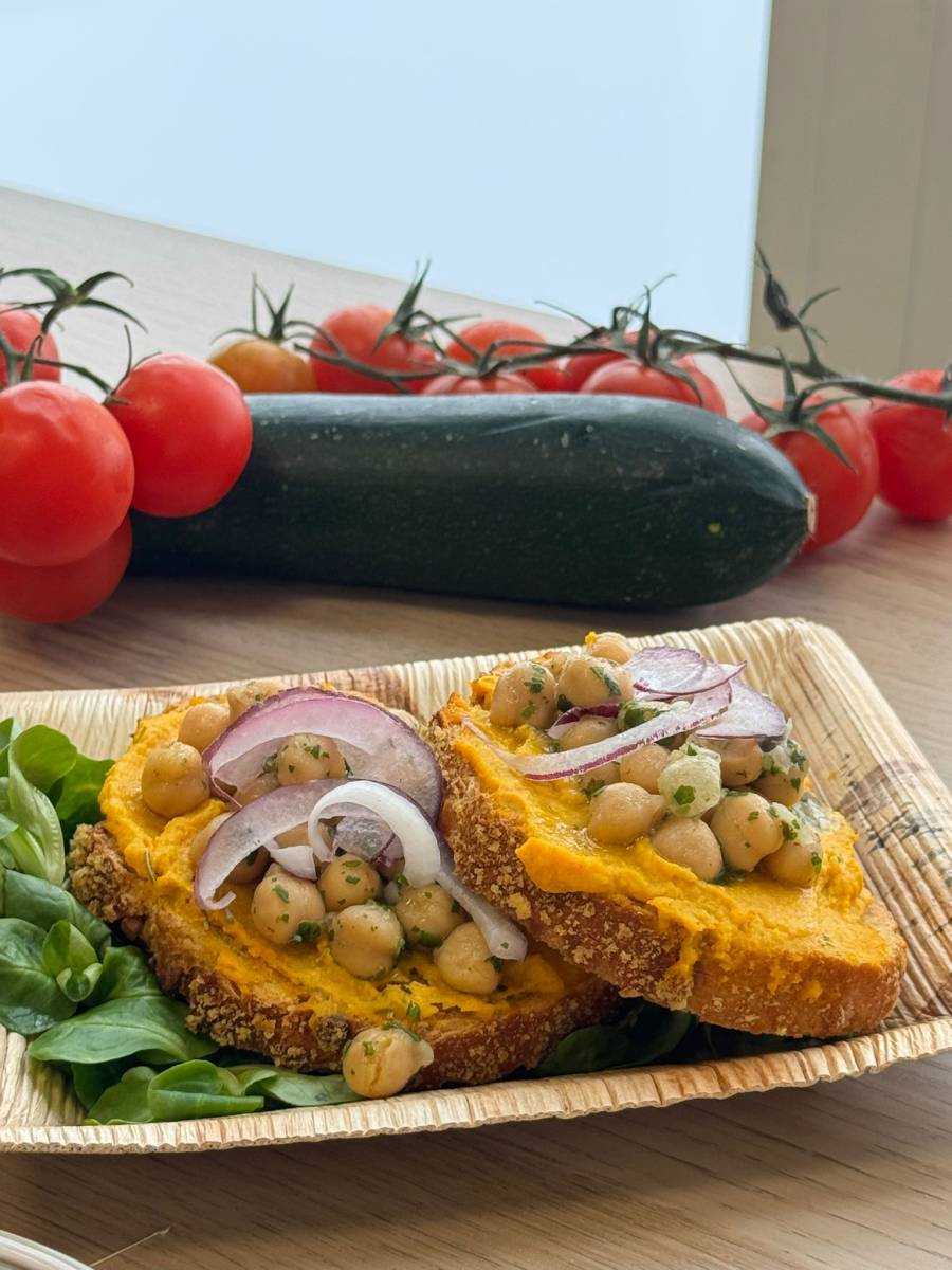 - Entrée : Tartine de houmous de patates douces, pois chiches et oignons rouges