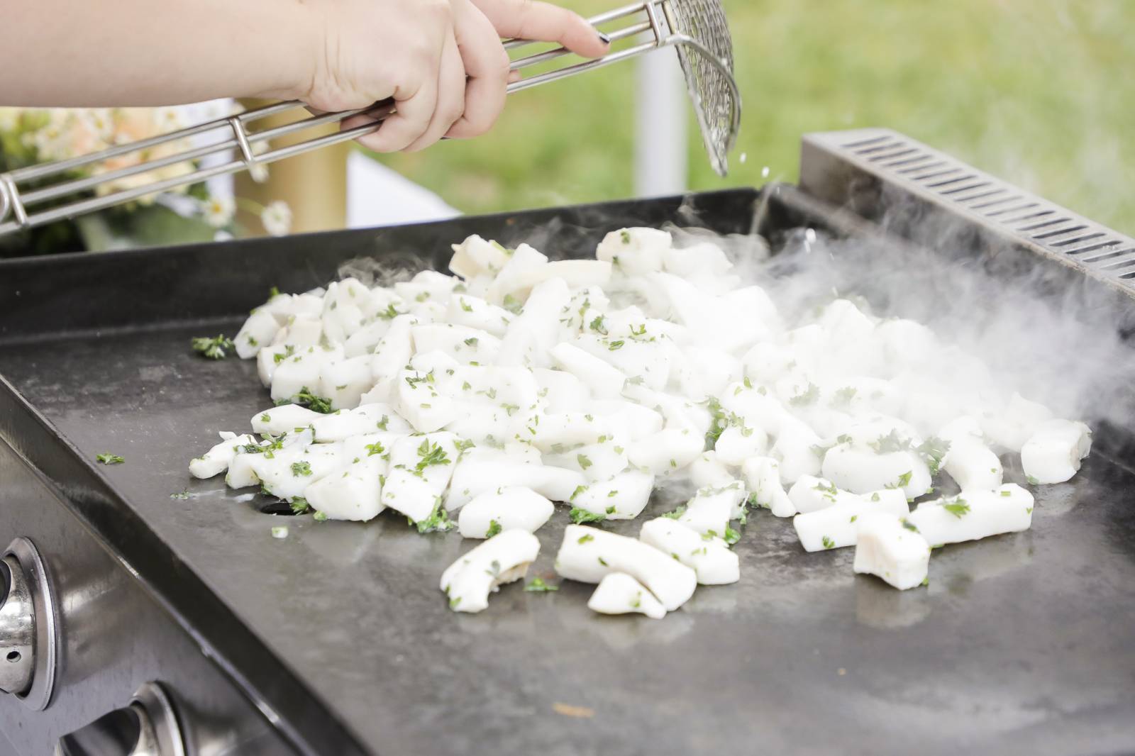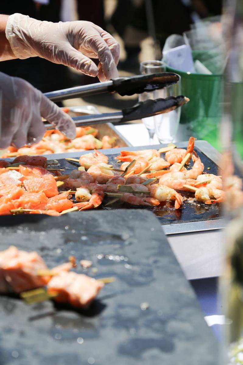 Les poissons et crustacés sont cuits à la plancha, servis en assiettes et proposés par nos serveurs à vos invités.
