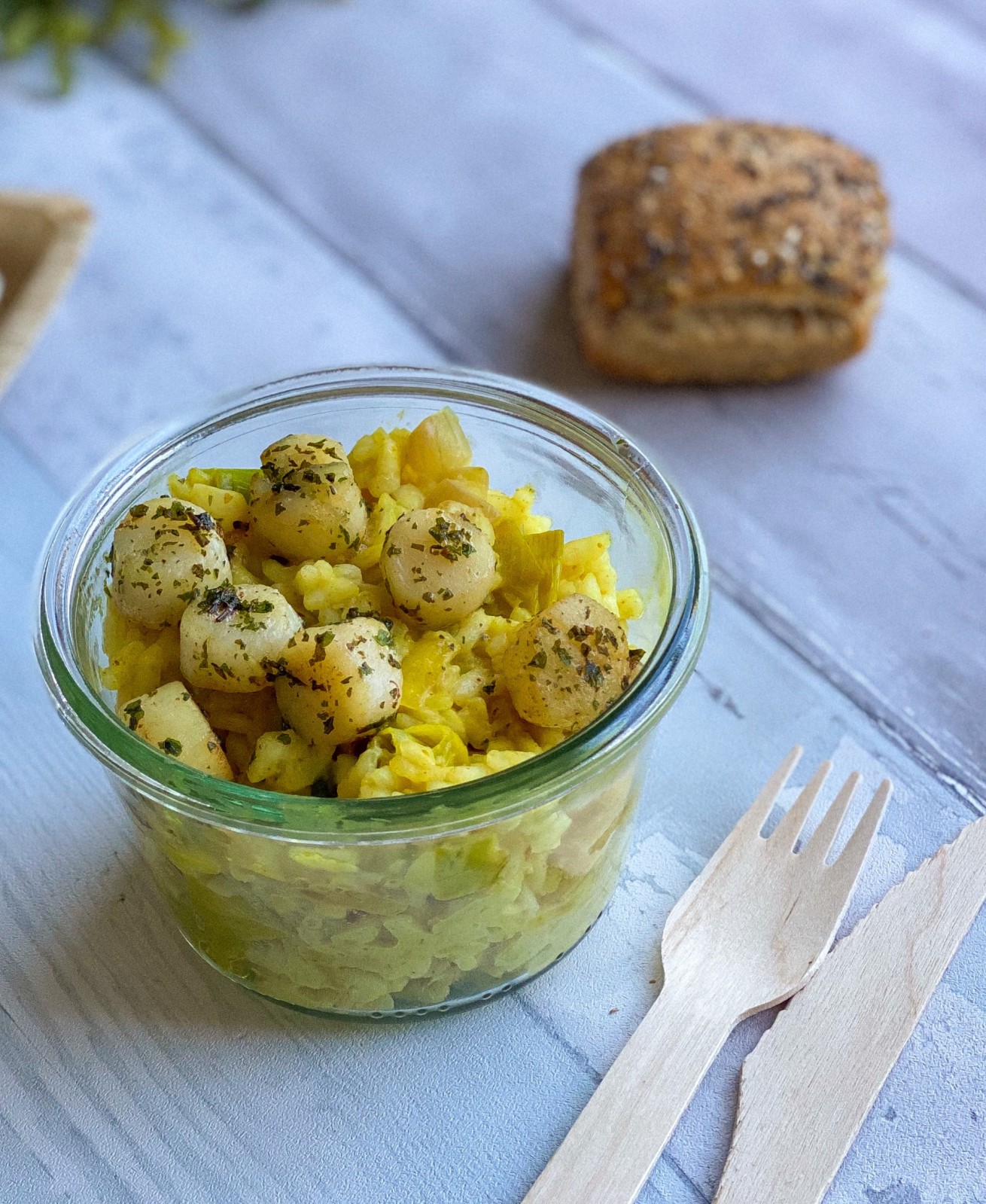 - En plat : saint jacques poêlées et risotto au poireau, pointe de curry,