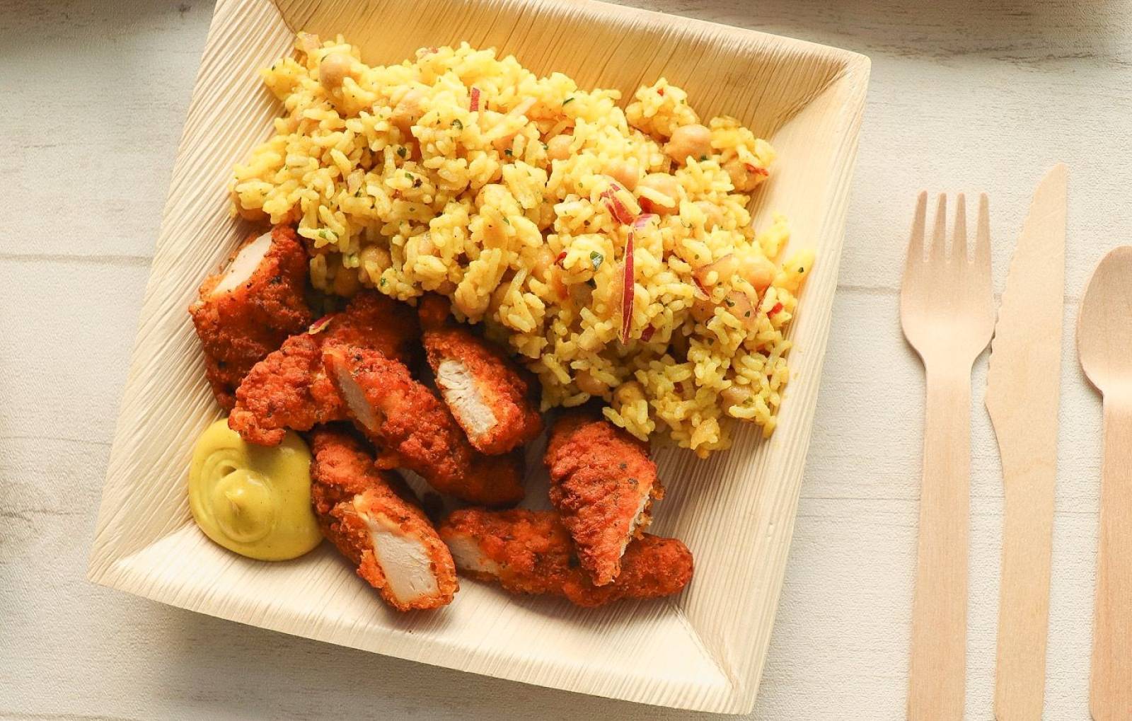 - Plat : Filets de poulet pané aux épices douces et salade de riz à l'indienne
